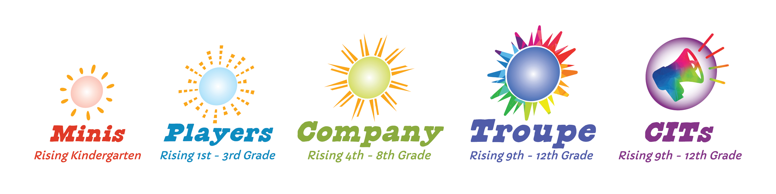 Our summer camp features programming for everyone from rising Kindergarten through the end of high school. Rising Kindergarten, Minis, and 1st-3rd grade campers, Players, participate in one-week sessions. Company, our rising 4th through 8th graders, participate in two-week sessions, with two one-week session offerings later in the summer. Finally, we have two options for our high school artists–our Counselor in Training (CIT) program and Troupe.